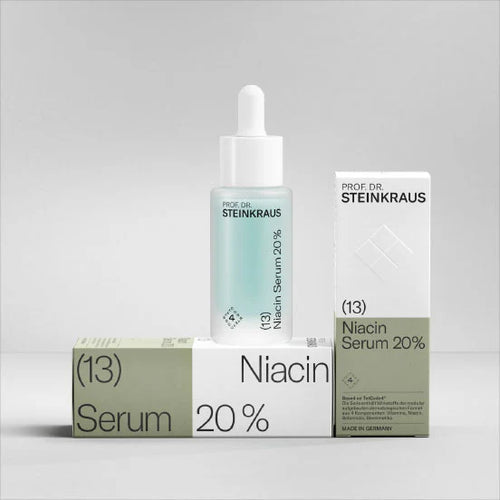 Da Niacinamid eine sehr gute Hautverträglichkeit aufweist, kann es lokal in hoher Konzentration (bis zu 20 %) aufgetragen werden. Dem (13) Niacin Serum 20% aus der TetCode4-Serie von Prof. Dr. Steinkraus wurde zusätzlich eine geringe Menge Hyaluronsäure (0,3 %) beigefügt, was dem Produkt spürbar pflegende Eigenschaften verleiht und für eine besonders angenehme Applikation sorgt. Den leicht bläulichen Farbton erhält das Serum durch bindegewebsstärkende Kupferionen.