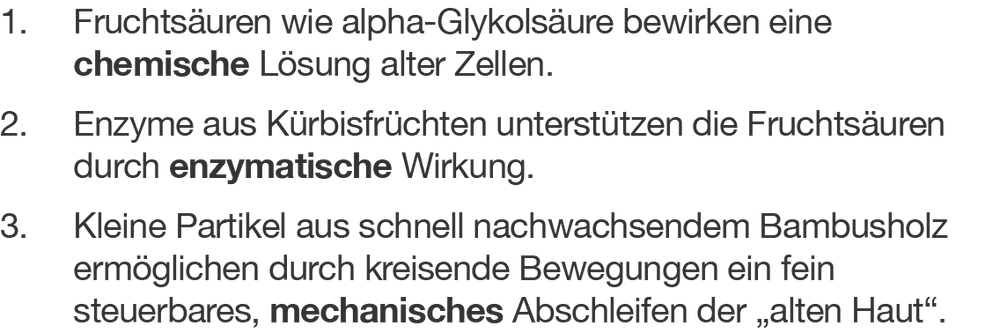 Diese Kombination führt zu einem exzellenten Peelingergebnis, das die Haut erfrischt, entschlackt und auf alle weiteren Behandlungs- und Pflegeschritte vorbereitet.
