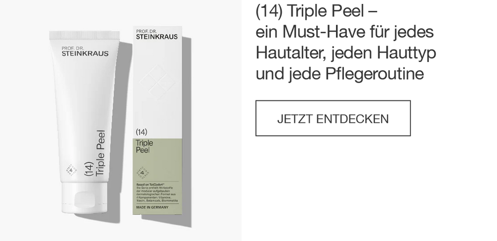 Ein solches Peeling lässt sich 1. chemisch, 2. enzymatisch oder 3. mechanisch erreichen. In dem neuen (14) Triple Peel von Prof. Dr. Steinkraus wurden diese drei Herangehensweisen kombiniert, wodurch ein eindrucksvoller Synergismus entsteht, der das Peeling mit einer einzigen Anwendung besonders effektiv macht. Eine behutsame Auswahl der Inhaltsstoffe und die richtige Auswahl der Wirkstoffkonzentrationen führen in einer fein balancierten Gesamtrezeptur zu einem großartigen Peelingerlebnis, das ideal in jedes Hautpflegeprogramm integriert werden kann, egal ob 1× oder 2× pro Woche angewendet.