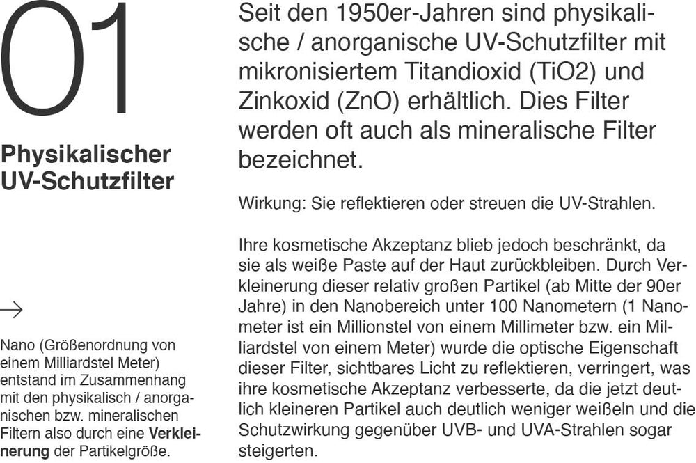 Physical/inorganic UV filters containing micronized titanium dioxide (TiO₂) and zinc oxide (ZnO) have been available since the 1950s. These filters are often referred to as mineral filters.