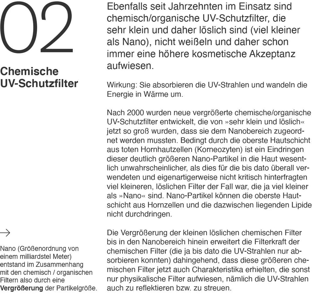 The use of nano-sized filters in sunscreens has therefore not only increased the quality of sunscreen filters in recent years, but also their safety for human health. The demonization of the term 'nano' lacks any rational basis.